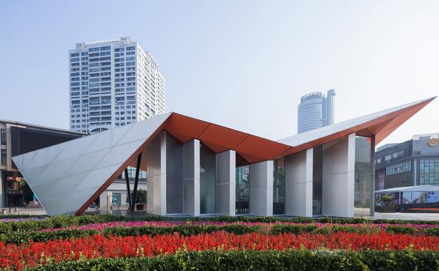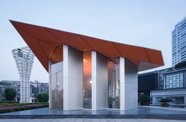 該建筑位于寧波市天一廣場(chǎng),占地面積僅178平方,整體建筑材料采用鋼管和鋁單板,建筑拋棄曲面屋頂采用折疊形式,整體呈現(xiàn)不規(guī)則幾何形態(tài),屋頂轉(zhuǎn)換也因使用功能而變化,整體造型像紙一樣折疊。由于整個(gè)建筑采用鋁板和鋼結(jié)構(gòu),從設(shè)計(jì)到施工只需要一個(gè)月。