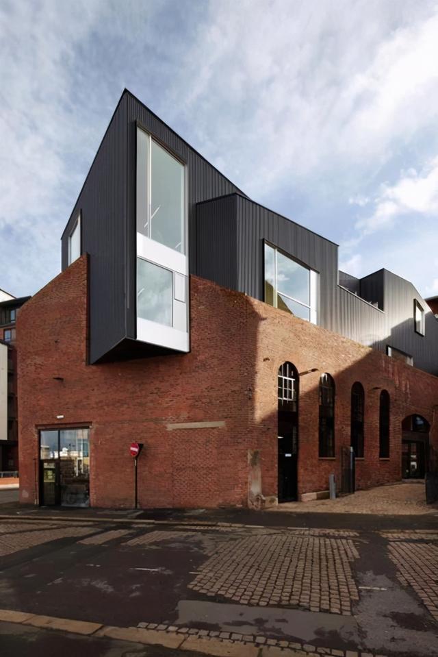 是否熟悉,邊肖上一期介紹了類似這樣的建筑。這座建筑建在維多利亞時(shí)代的一座古老工業(yè)磚建筑上。新的黑色鋁板屋頂穿過原建筑的外殼,堪稱古老與現(xiàn)代的完美結(jié)合。兩個(gè)時(shí)代的建筑再次碰撞。