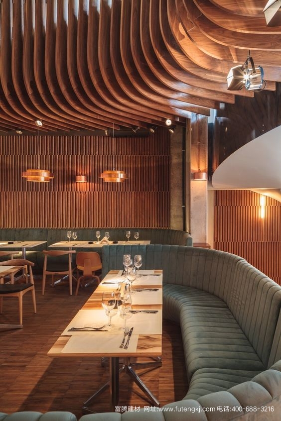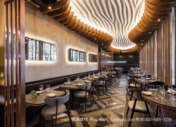 弧形鋁方通造型吊頂為卓越設(shè)計提供了強有力的奠基石。其獨特的形狀和設(shè)計風(fēng)格賦予了空間更為柔和和流暢的感覺。吊頂不再只是功能性的天花板,更成為了空間設(shè)計中的重要藝術(shù)元素,為整個空間增色不少。
